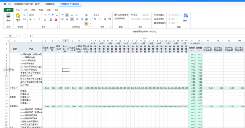 从表格大概内容框架,我们分析得:这是一个基于产品分组+产品维度编制的年度销售预算表,周期类型包含年、月。