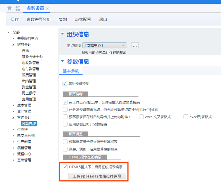 1 启用H5在线编辑。通过系统管理员用户登录,在预算管理系统参数下,勾选【HTML5模式下,启用在线报表编辑】。(目前仅星空公有云租户可直接启用该参数,其他私有云客户需免费申请并上传SpredJS控件许可,如有需要,请联系在线客服或KSM提单)