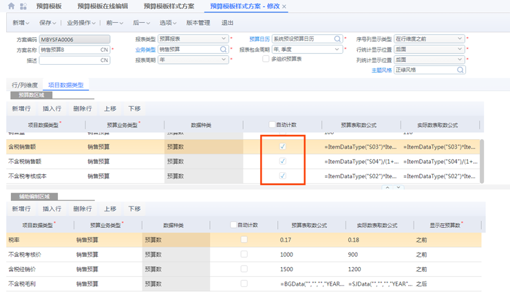 1. 在模板样式方案中,设置项目数据类型是否“自动计算”。