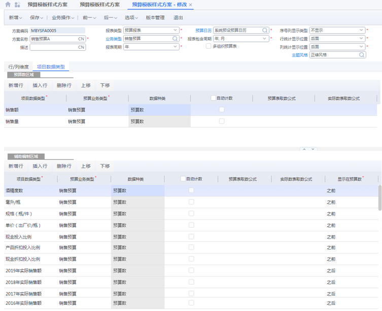将酒精度、毫升/瓶、规格(瓶/件)、单价(出厂价/瓶)、现金投入比例、产品折扣投入比例、现金折扣投入比例,添加到辅助编制区域,设置为显示在预算数之前。