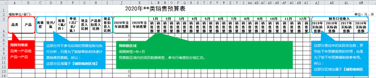预算表中,在预算数区域之后的2019-2016年实际销售额列,在本表中只是作为下年销售预算的一个编制参考,故同样也纳入辅助编制区域。