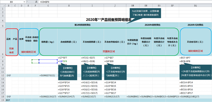 预算表中,预算维度之后的列(酒精度数、毫升/瓶、规格(瓶/件)、单价(出厂价/瓶)、现金投入比例、产品折扣投入比例、现金折扣投入比例), 在本表中只是作为计算*终各月销售额、销售量的一个计算基础,这些列的数据并不是每个预算期间(每个月)都不同,而是预计相对固定的值,故纳入辅助编制区域。